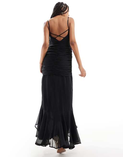 ASOS DESIGN ruched front high low frill maxi dress in black