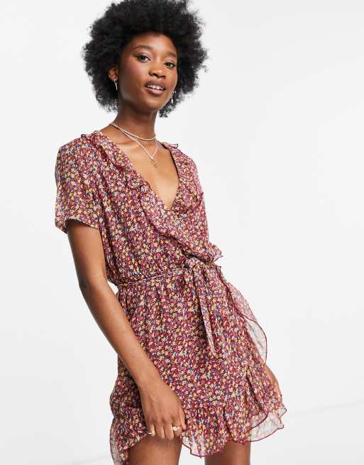 JDY chiffon mini wrap dress in burgundy floral ASOS