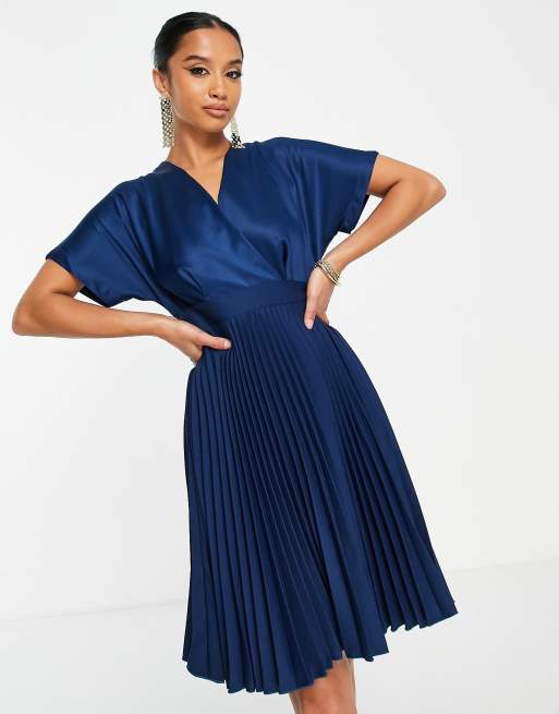 Closet London Petite wrap front pleated mini skater dress in navy