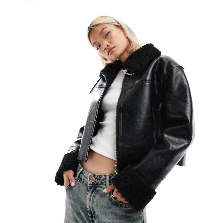COLLUSION Unisex faux leather aviator jacket with contrast lining in black ASOS