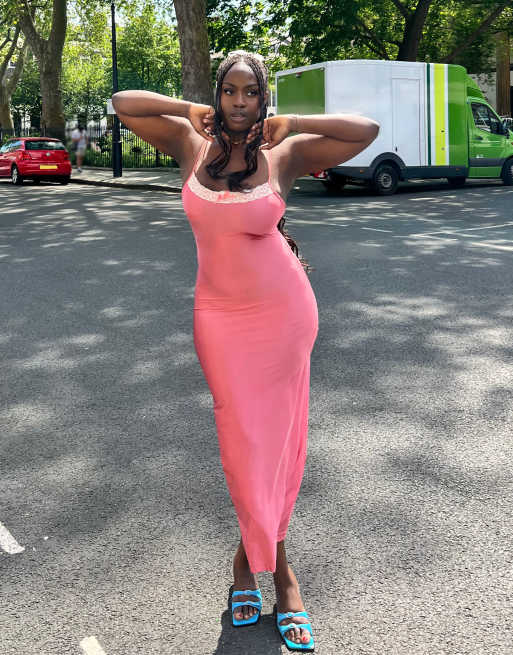 Labelrail x Sumbo Owoyele Slinky Lace Detail Cami Maxi Dress in Coral Pink Orange