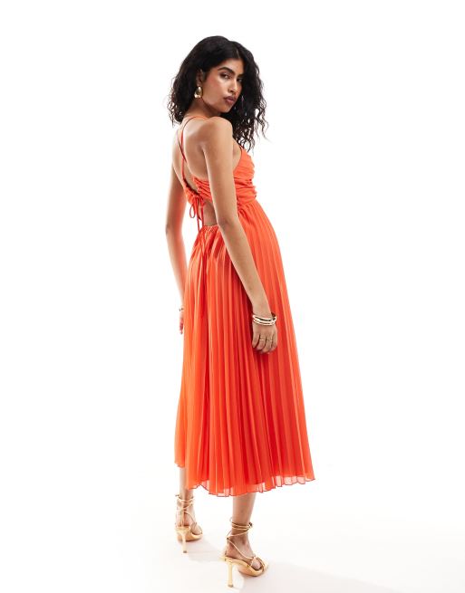 Coral pleated midi dress deals, ASOS Design Pleated Bodice Strappy Pleat Midi Dress with Tie Back Detail in Coral Red deals