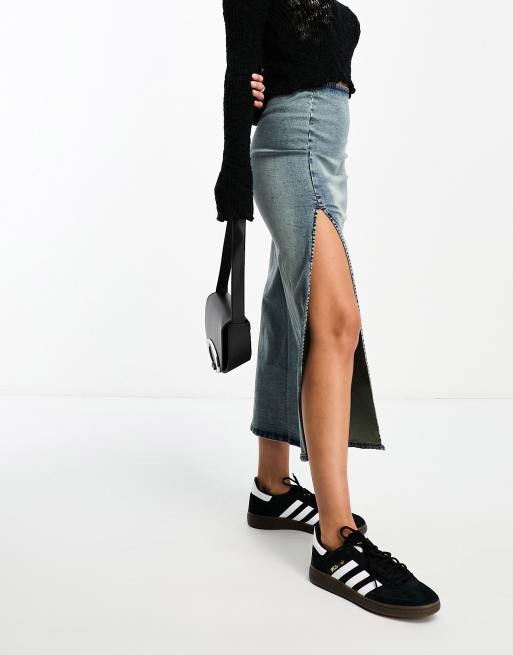 Unique Bargains Women s High Elastic Waist Split Front Denim Bodycon Midi Skirt M Blue Walmart