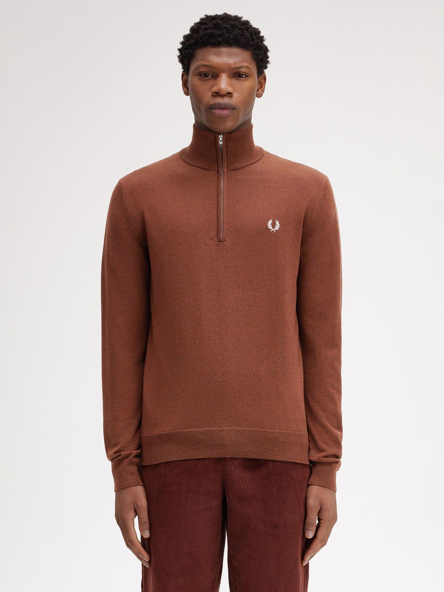 Fred Perry Zip Neck Merino Wool Blend Jumper Whisky Brown