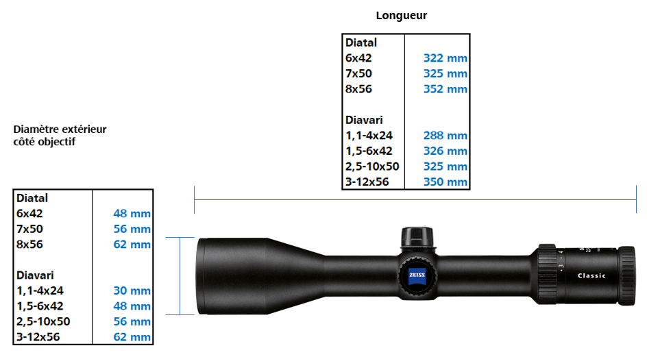 Quelles sont les dimensions du ZEISS lunette de visee Classic Diatal and Classic Diavari