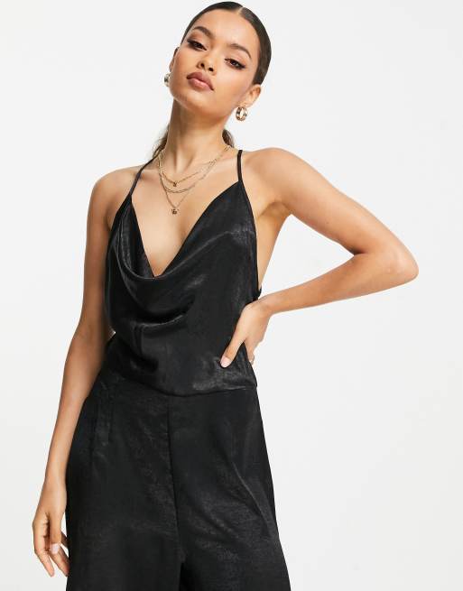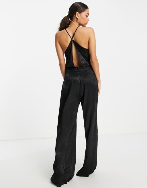 Missguided Petite satin cowl neck wide leg jumpsuit in black