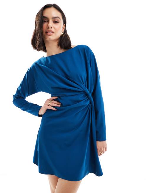 ASOS Design Slash Neck Knot Detail Mini Dress in Navy Multi