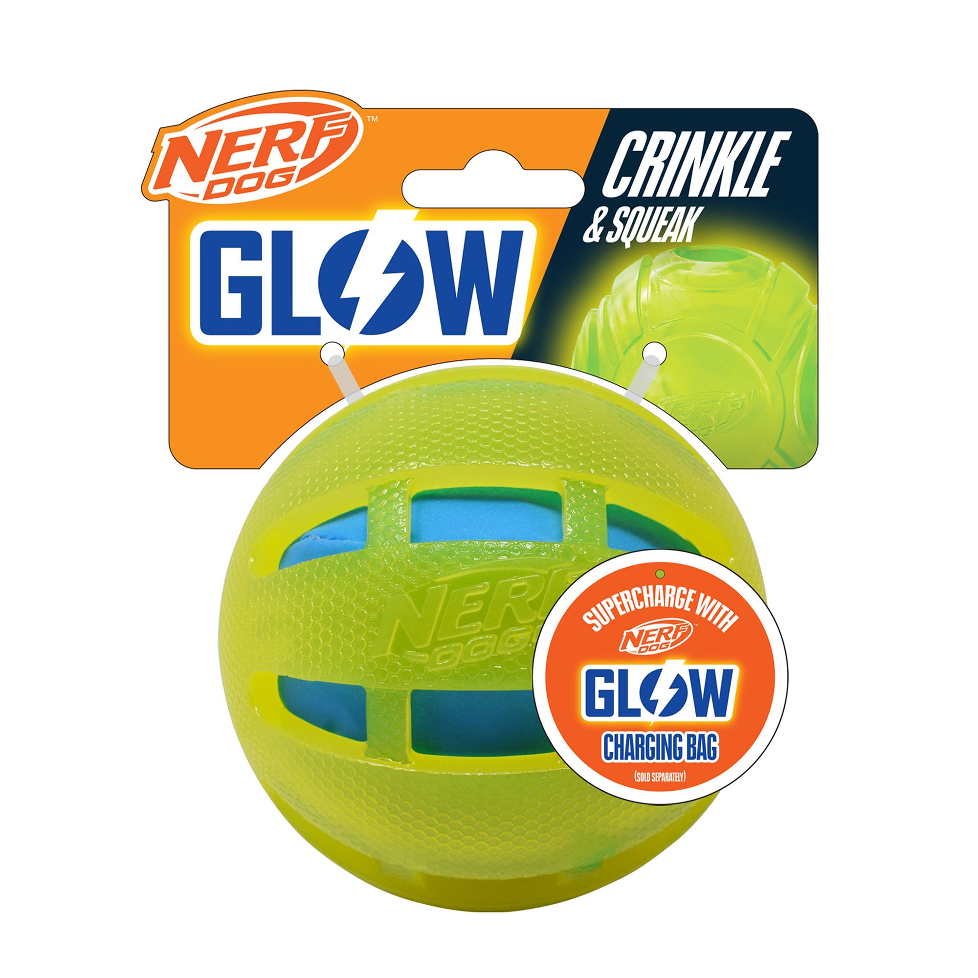 Nerf Dog Glow Checker Squeak and Crunch Ball Yellow