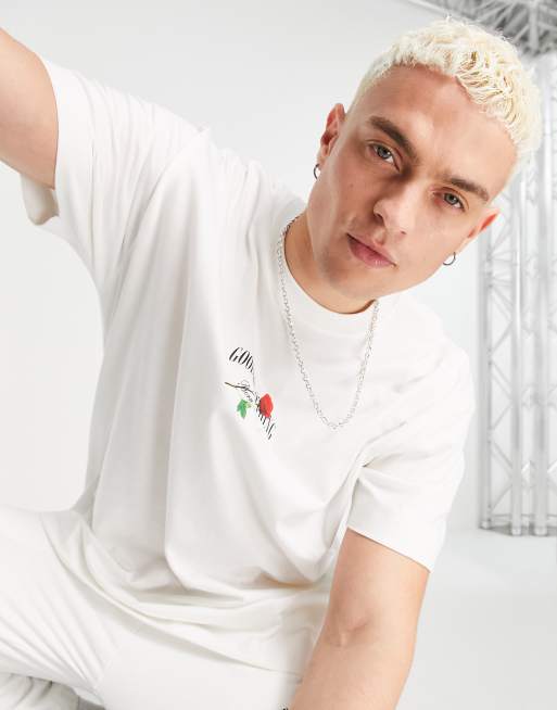 Good For Nothing oversized T shirt in off white with chest and back rose logo print