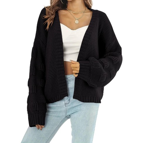 Womens Chunky Sweater Cardigan Open Front Cable Knit Sweater with Lantern Sleeve Black XL