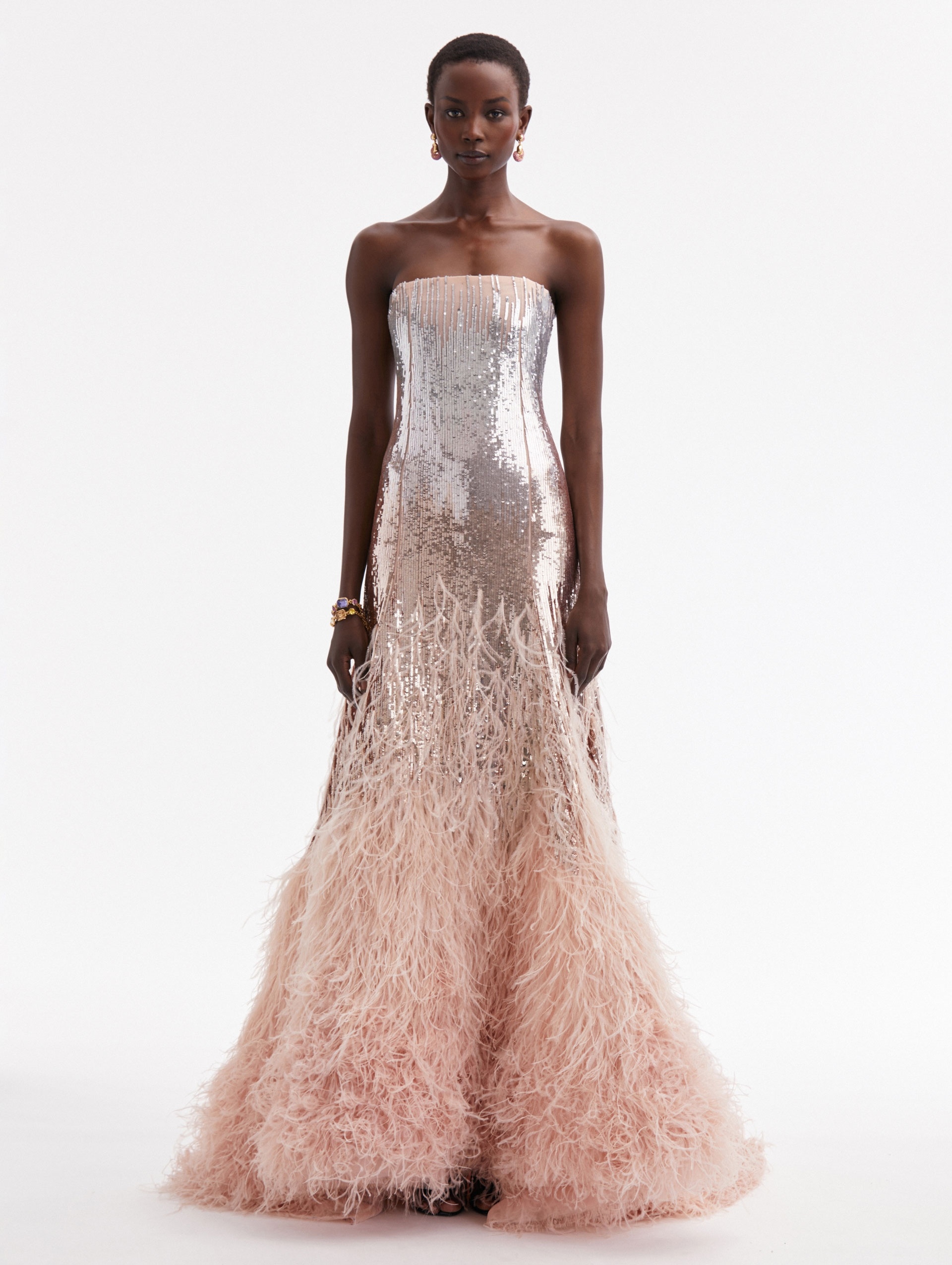 Oscar de la Renta SEQUIN FEATHER EMBROIDERED GOWN REVERSIBLE