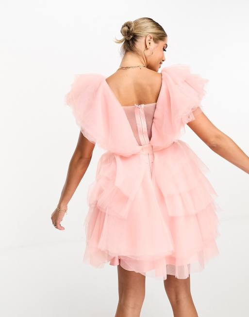 Forever Unique tie waist ruffle tulle mini dress in powder pink