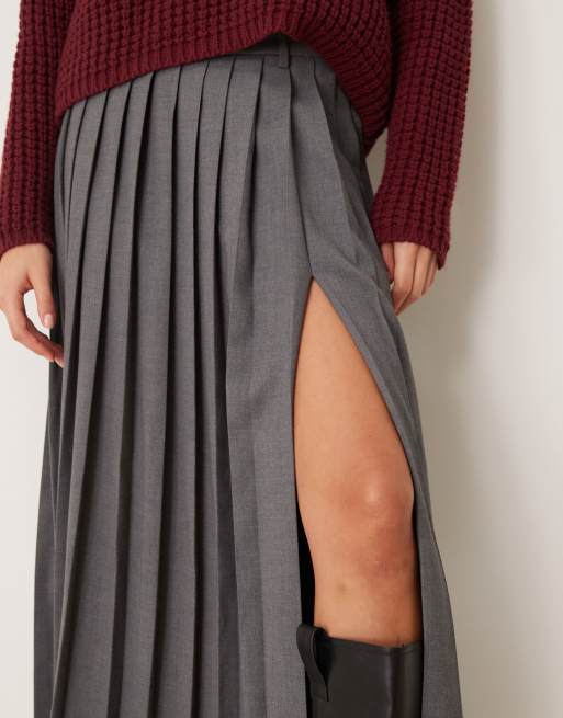 Abercrombie Fitch mid rise pleated maxi skirt with side slit in grey