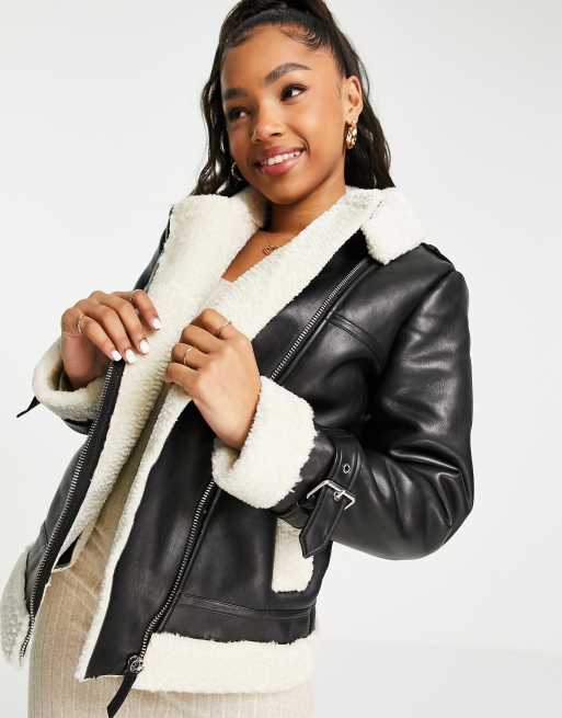 Pimkie faux leather aviator jacket with contrast borg trim in black