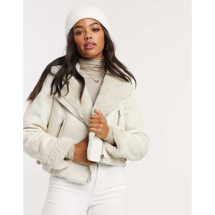 Stradivarius crop faux leather aviator jacket with sherpa lining in ecru