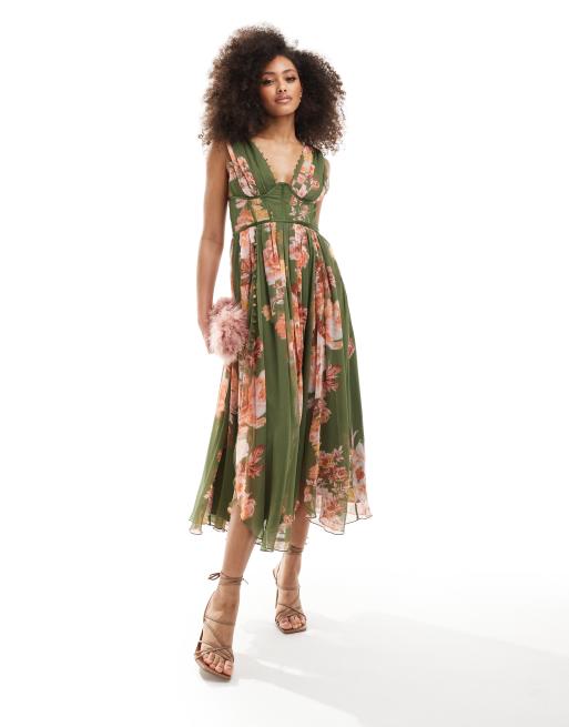 ASOS DESIGN corset plunge pleated midi dress with button detail in green floral print ASOS