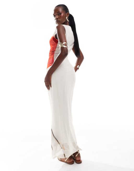 ASOS DESIGN sleeveless mesh midaxi dress in cream with rose placement print