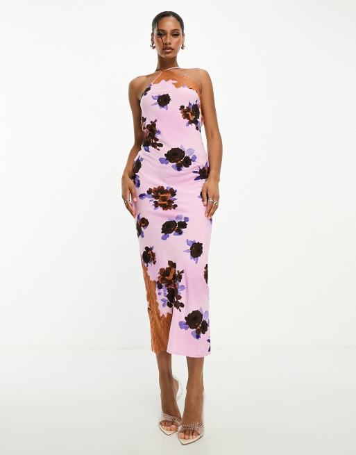 ASOS DESIGN one shoulder strappy midi dress with lace trim in spaced floral ASOS