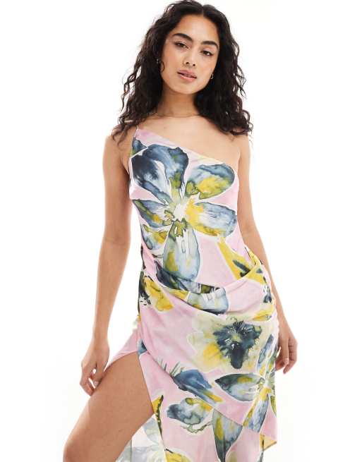 ASOS DESIGN satin one shoulder draped maxi dress with thigh split in floral print ASOS