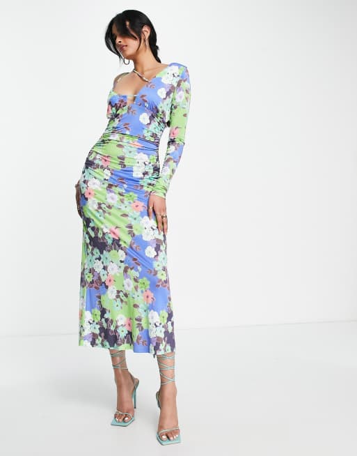ASOS DESIGN strappy one shoulder midi dress with ruching detail in bright floral