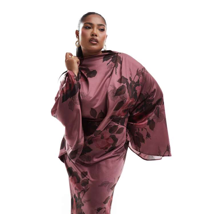 ASOS DESIGN Curve satin wrap maxi dress with drape bodice and kimono sleeve in pink floral ASOS