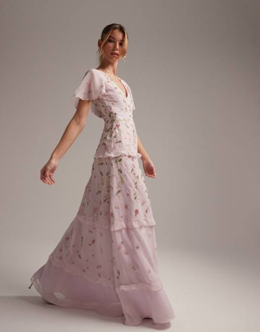 Asos pink maxi deals, ASOS DESIGN Bridesmaid flutter sleeve embellished wrap maxi dress with embroidery in light pink ASOS deals