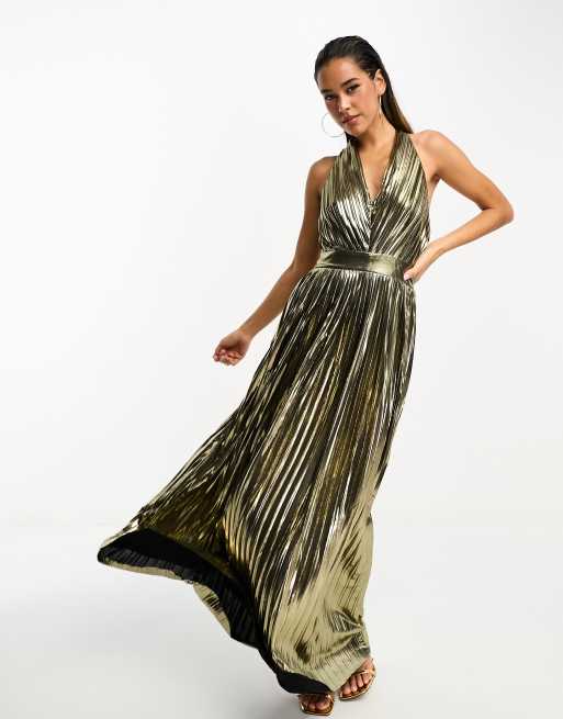 TFNC Plus Bridesmaid satin pleated halter neck maxi dress with full skirt in sage