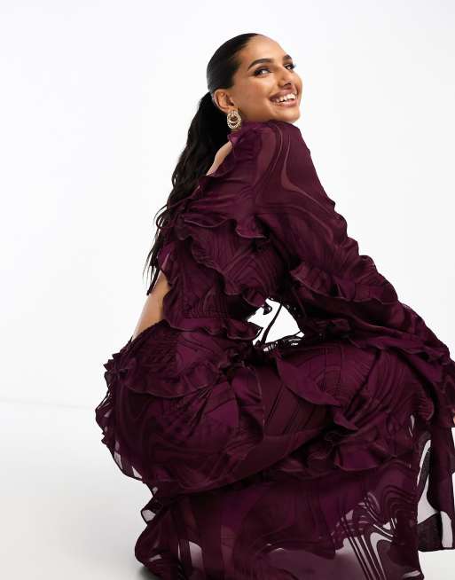 ASOS DESIGN Robe longue tendance folk en satin devore a decoupe et volants avec manches evasees Bordeaux