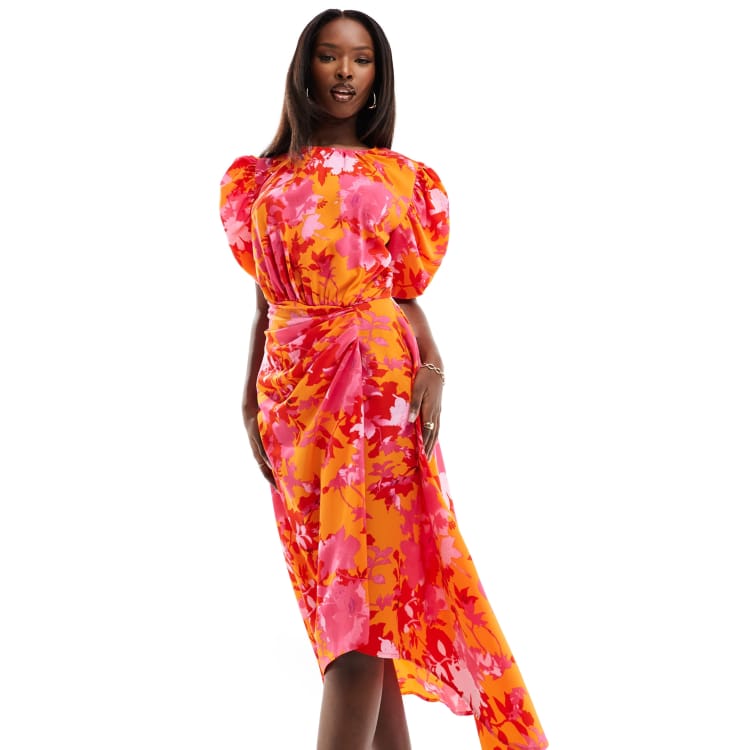 AX Paris satin puff sleeve drape detail midi dress in orange and pink floral ASOS